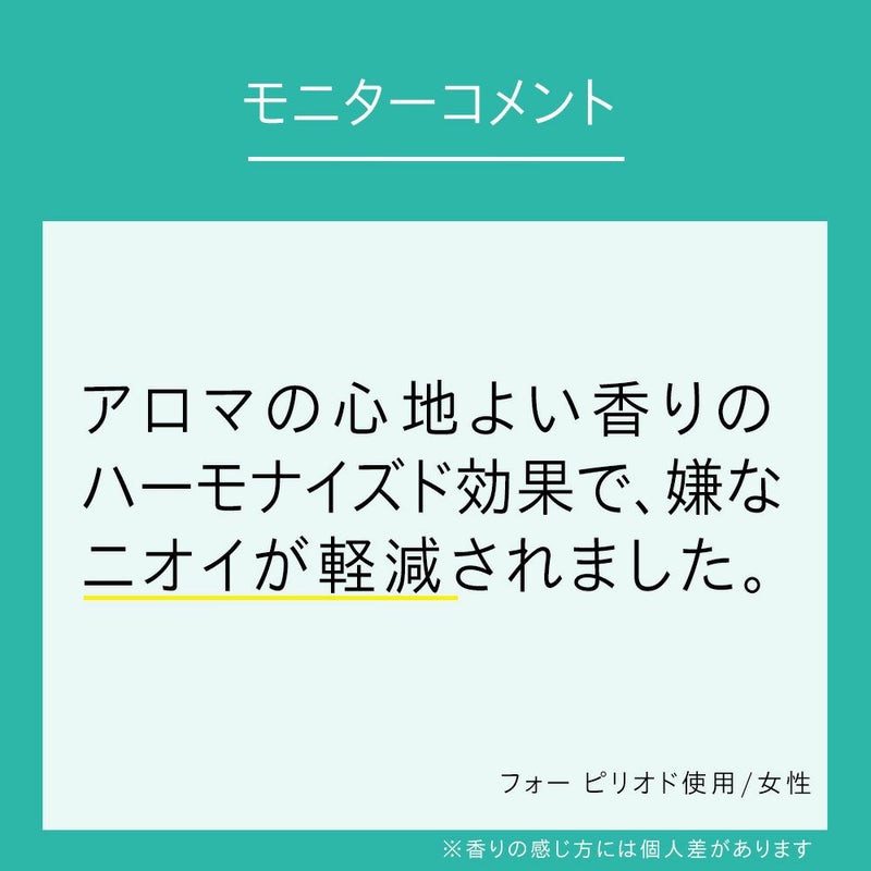 悪臭を包み込み、目立たなくし、イイ香りの質・印象に変換するハーモナージュ効果をもつ機能性香料(Transodor@ Technology)を採用しています。(アロマシューターfor periodのみ)