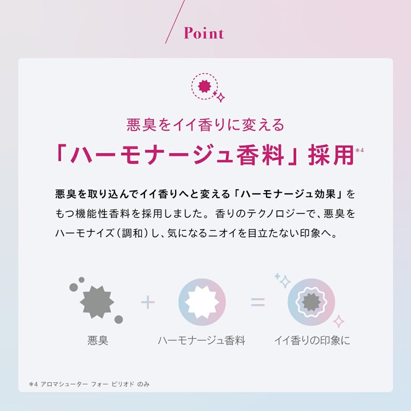 悪臭を包み込み、目立たなくし、イイ香りの質・印象に変換するハーモナージュ効果をもつ機能性香料(Transodor@ Technology)を採用しています。(アロマシューターfor periodのみ)