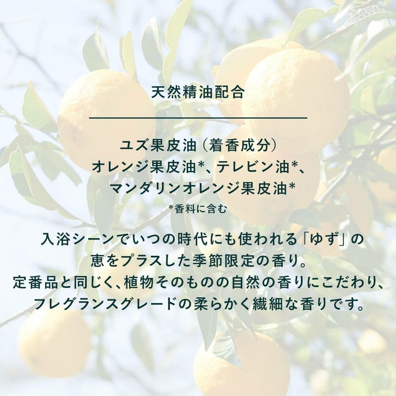 「アップサイクルのユズ香料(*廃棄予定の柚子を原料使用した香料のこと)を採用」