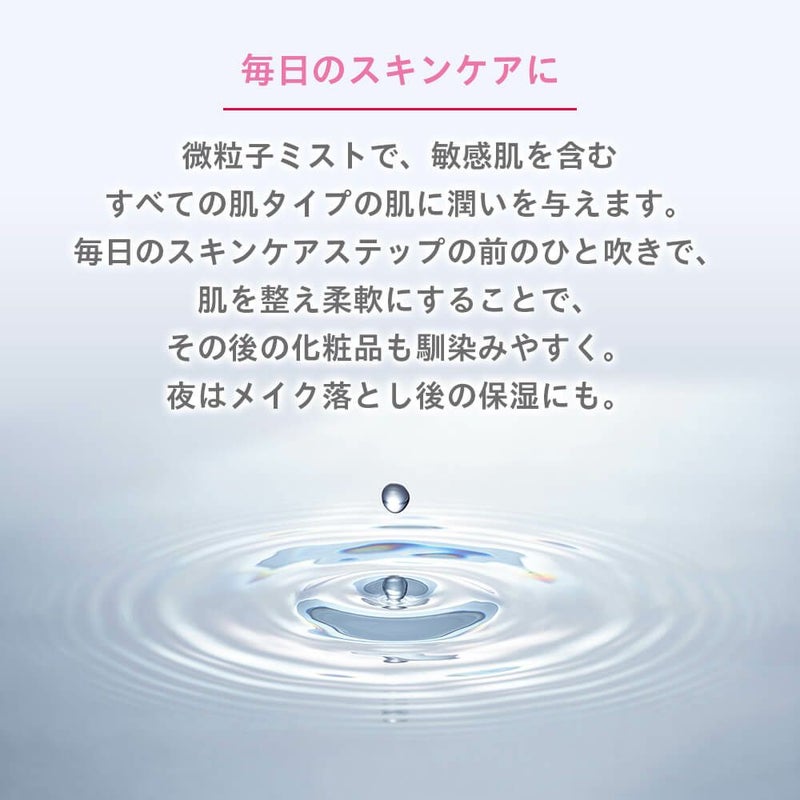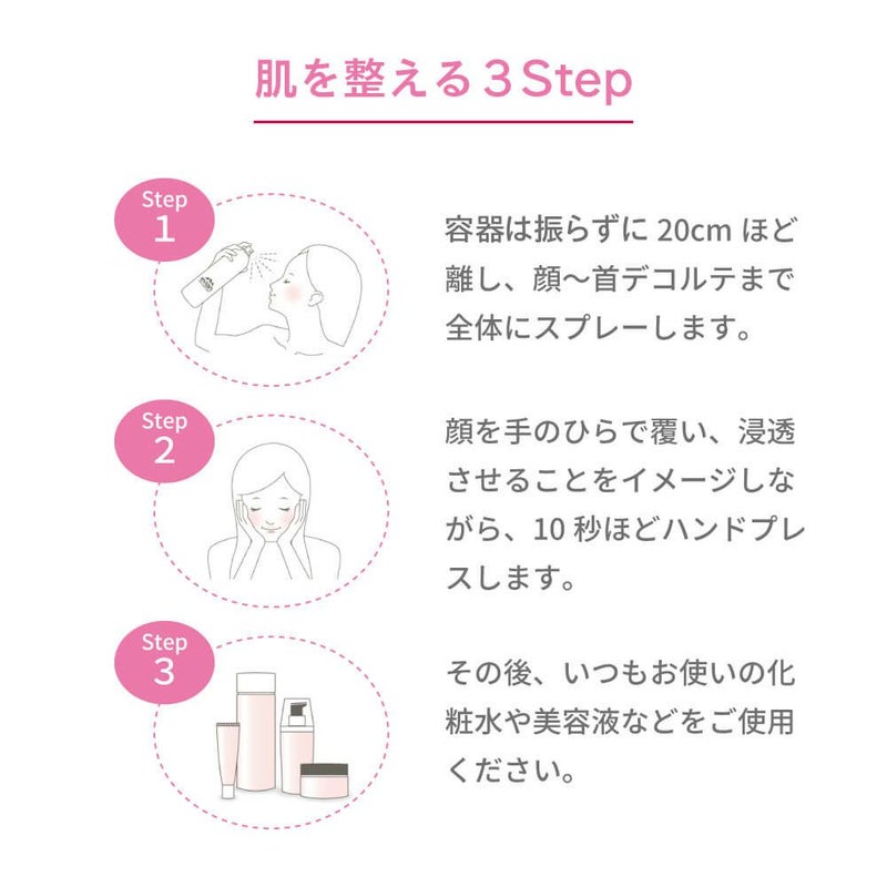 フレンチアルプス生まれの100%ナチュラルミネラルウォーター。 ミネラルを豊富に含んだ微粒子のスプレーが、お顔をはじめ全身をうるおいで満たします。 毎日のスキンケアステップの前にひと吹きしてあげることで、その後の化粧品の浸透力※をサポートしてくれる化粧水です。 ※角質層まで アルコール、防腐剤、鉱物油、着色料フリー ご使用方法:お顔から20cm程はなし、スプレーして手のひらでおさえるようになじませてください。
