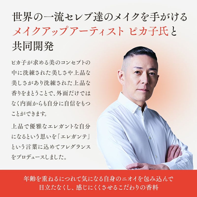 ピカ子が求める美のコンセプトの中に洗練された美しさや上品な美しさがあり洗練された上品な香りをまとうことで、外面だけではなく内面からも自分に自信をもつことができます。上品で優雅なエレガントな自分になるという思いを「エレガンテ」という言葉に込めてフレグランスをプロデュースしました。