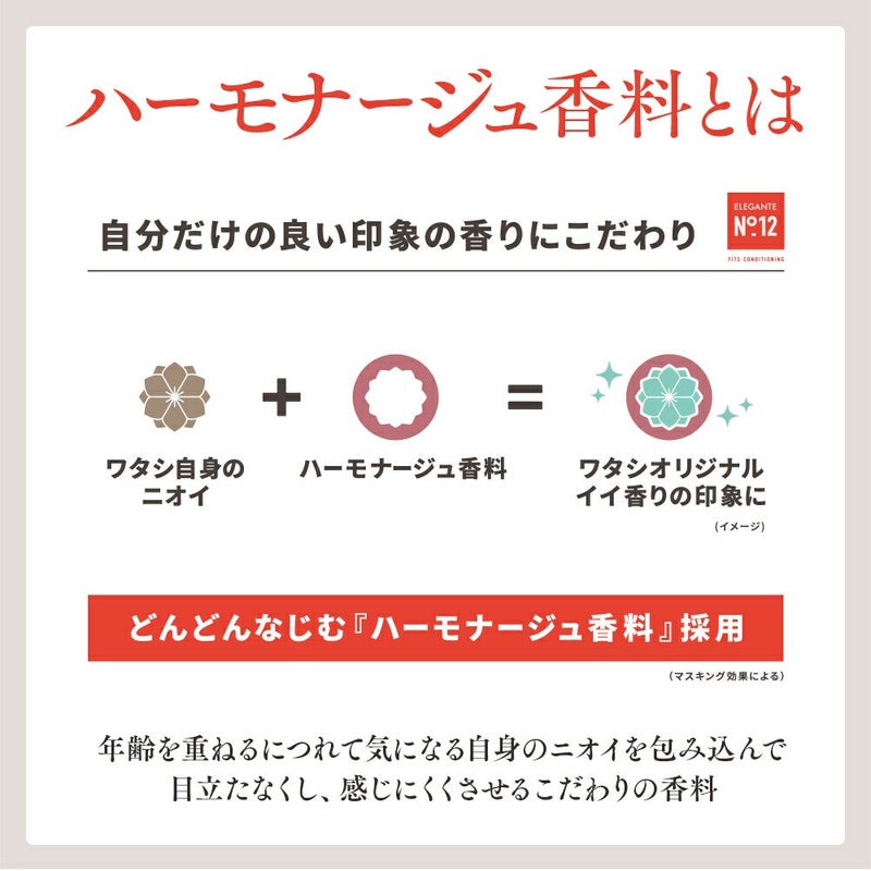 自分自身の“ニオイ”を包みこんで感じにくくさせる(マスキング効果による)「ハーモナージュ香料(メーカー呼称)」を採用。