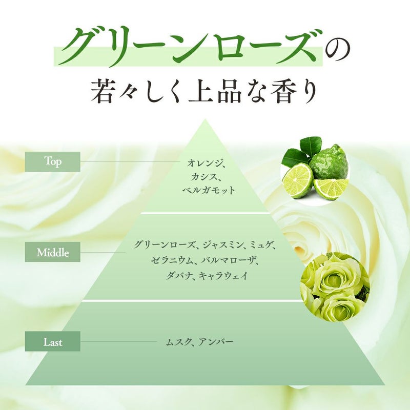 MIDDLE:グリーンローズ、ジャスミン、ミュゲ、ゼラニウム、パルマローザ、ダバナ、キャラウェイ