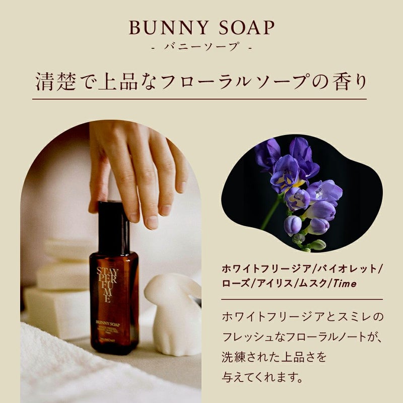 「時間」がテーマであるSTAY PERFUMEは、100種類以上から選び抜かれた、モムチならではの上品な香り。トップノート、ミドルノートを経て香りが変化したのちのベースノートの持続性にこだわった、さりげない香りが魅力です。