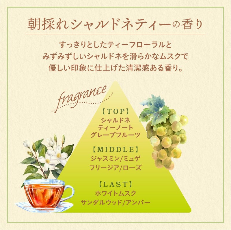 すっきりとしたティーフローラルとみずみずしいシャルドネを滑らかなムスクで優しい印象に仕上げた清潔感ある香り。