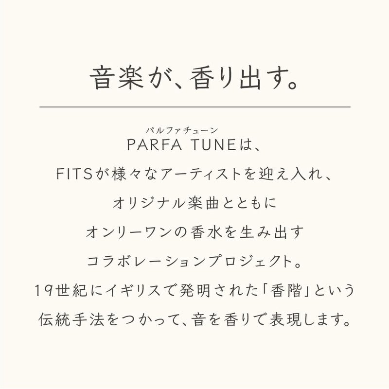 PARFA TUNEは、FITSが様々なアーティストを迎え入れ、オリジナル楽曲とともにオンリーワンの香水を生みだすコラボプロジェクト。19世紀にイギリスで発明された「香階」という伝統的な手法をつかって、音を香りで表現します
