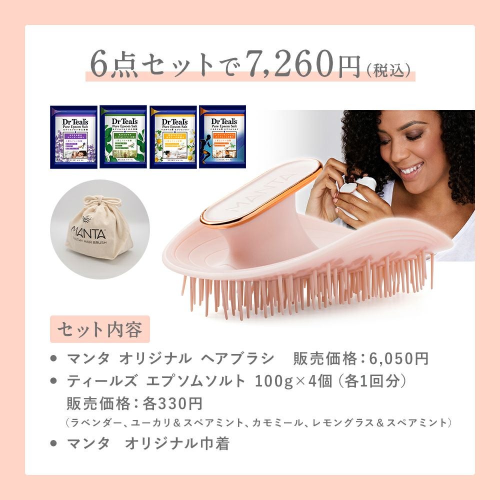 他の画像を見る 母の日ギフト いつもお世話になっている方に向けて送る、リラックスタイムのためのギフトセットです。 【オリジナル巾着つき】マンタ オリジナルブラシ ピンク&ティールズ 1回分×4種 ギフトセット 通常価格 ¥ 7,260 のところ 限定価格 ¥ 7,260 税込 販売を終了しました。 詳細はこちら 詳細を見る