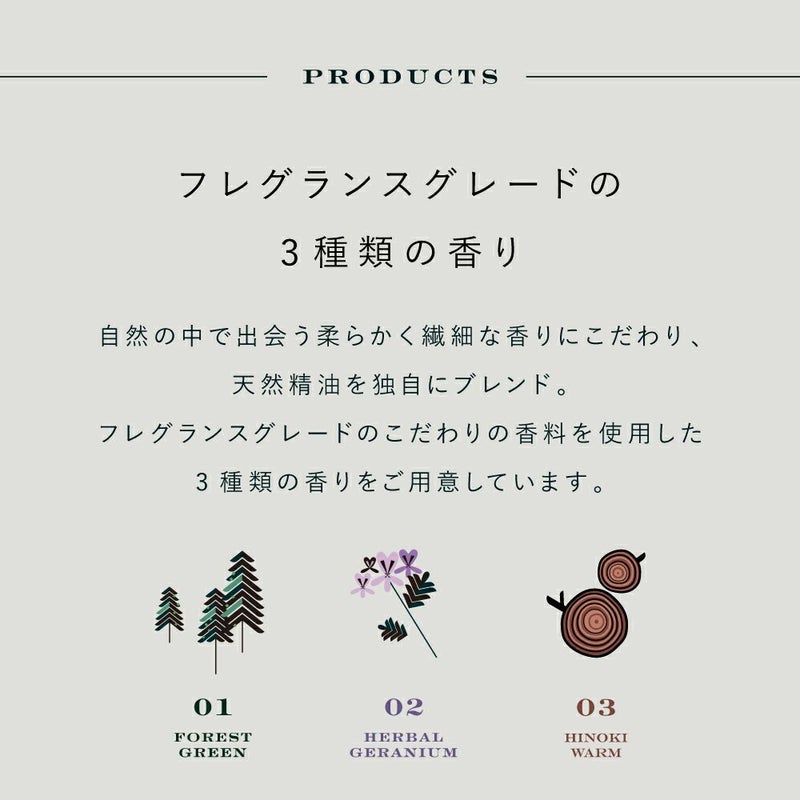 懐かしく温かみを感じるヒノキにやわらかいフローラルの香りをアクセントにしたナチュラルなフローラルウッディの香り。