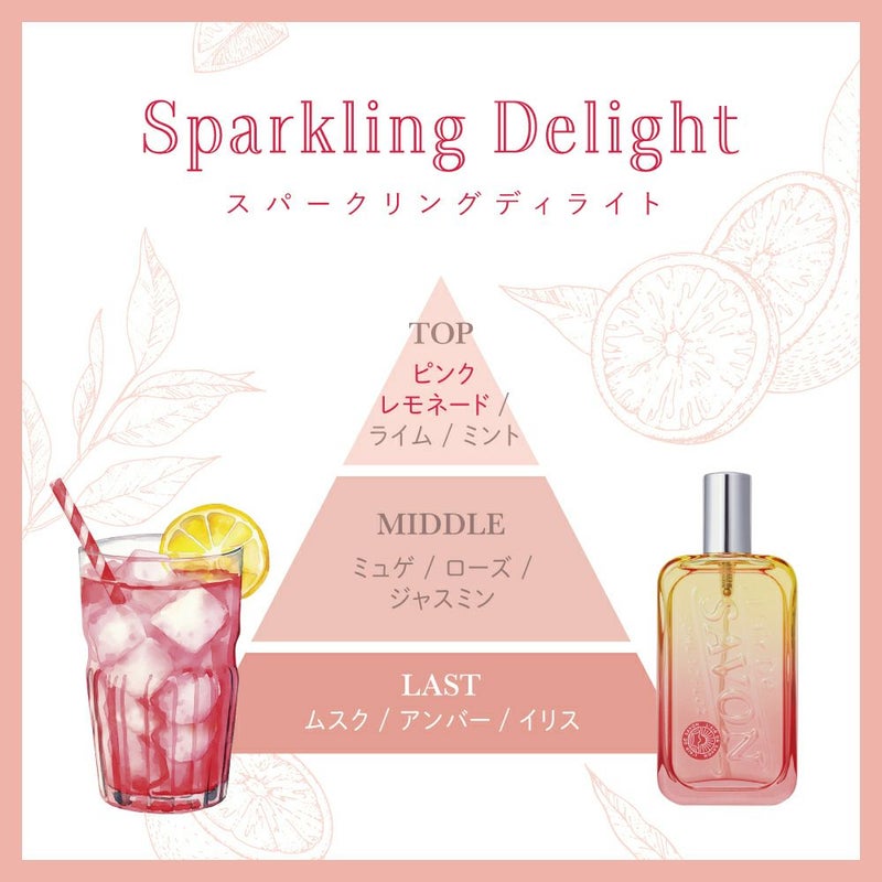 【香調】ピンクレモネードの甘酸っぱさとほろ苦さ、そこにミントの爽快感が重なり合った冷涼感のある香り