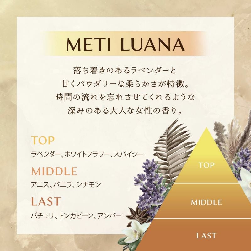 METI(メティ)=「時間を感じさせない」TIMEを逆から読んだ造語です。LUANA(ルアナ)=ハワイ語で「ゆっくり、リラックス」を意味します。