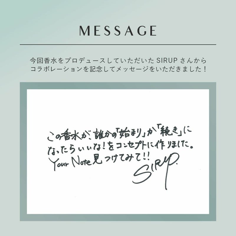 ナチュラルさや洗練されたシンプルさをテーマに、SIRUPのタトゥーをアイコニックに落とし込んだデザイン。さらに箔押しのニコちゃんマークを重ね、「完成したものを壊す」SIRUPの遊び心を表現。ボトルの白マットのグラデーションは、クリアなトップから柔らかく落ち着いていく香りの変化をイメージしたデザイン。