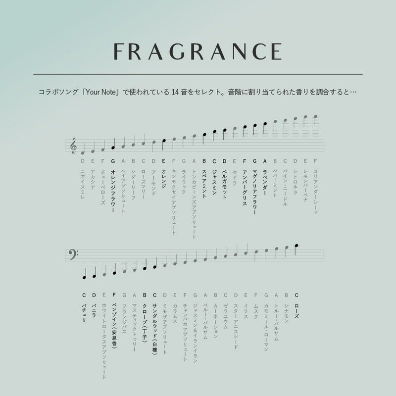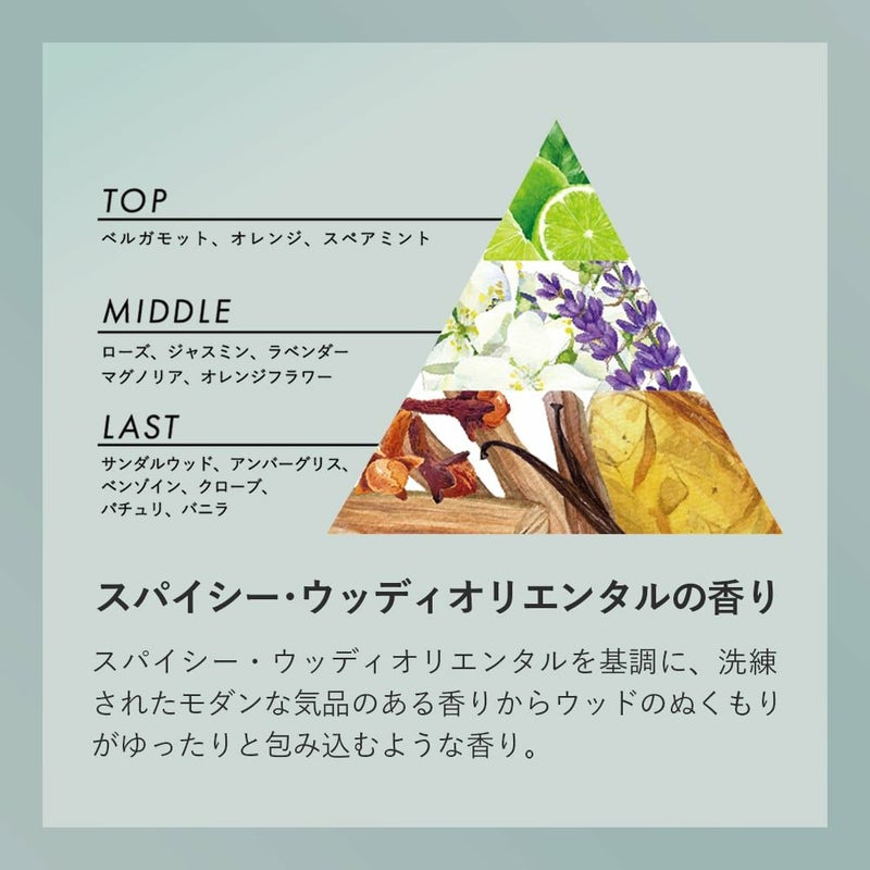 トップの爽やかな柑橘とスペアミントが正装に身を包んだかのようなモダンな気品を引き立て、ミドルノートの軽やかなフローラルがそっと寄り添うように広がる。花々が奏でる調和が過ぎると、スパイシーなクローブや芳醇なバニラが清高で官能的な一面を見せる。