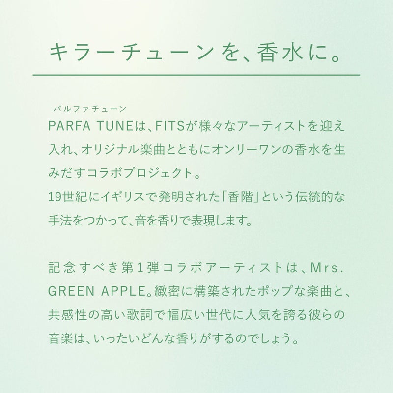 PARFA TUNE(パルファチューン)は、FITSが様々なアーティストを迎え入れ、オリジナル楽曲とともにオンリーワンの香水を生み出すコラボプロジェクト。
