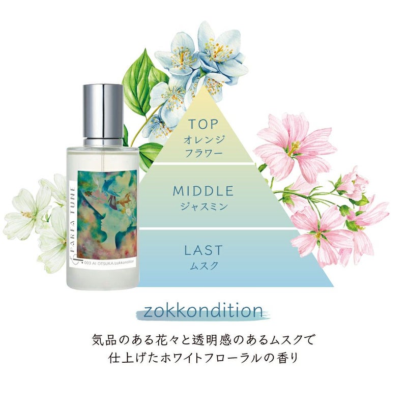 PARFA TUNEは、FITSが様々なアーティストを迎え入れ、オリジナル楽曲とともにオンリーワンの香水を生みだすコラボプロジェクト。19世紀にイギリスで発明された「香階」という伝統的な手法をつかって、音を香りで表現します