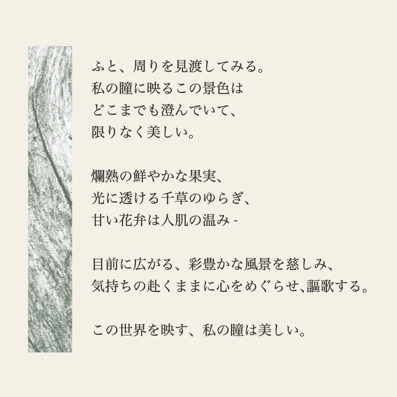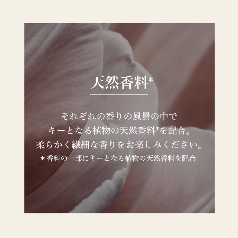 柔らかな光を纏った色彩、豊かな自然の楽園の情景を想わせる香りです。