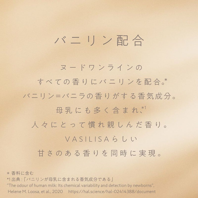 バニリン=バニラの香りがする香気成分。母乳にも多く含まれ*1、人々にとって慣れ親しんだ香り。VASILISAらしい甘さのある香りを同時に実現。